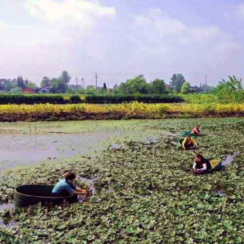 每當(dāng)秋季,邵伯鎮(zhèn)大小湖塘的水面上,全是碧綠一片,只見“叢叢菱葉隨波起,朵朵菱花背日開”,像是鋪了一層翡翠,密密匝匝,簇簇?fù)頁?。采菱女漫身在木盆中,紅衣綠葉,暖風(fēng)美喉,如在畫中游動(dòng)。只見,遠(yuǎn)處,碧波一湯漾,飛蜓野荷;岸上,壟田阡陌,煙村疏林;近旁,青菱白花,搖曵生姿,構(gòu)成了一幅秋日特有的旖旎圖畫,成了邵伯一道亮麗的風(fēng)景線。